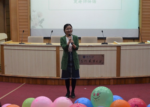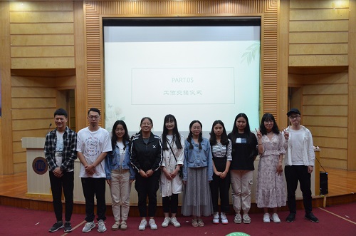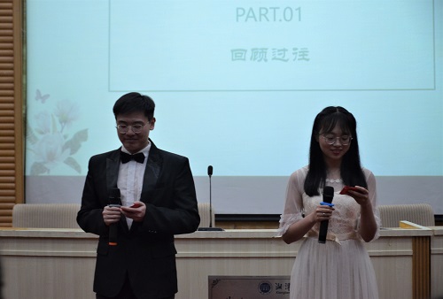 节目表演结束,夏妮老师上台致辞。她对所有人一年以来的默默付出表示感谢,希望大家能够因信任而开始、因责任而留下,并表达了对大家的诚挚祝愿。在这个既代表着别离也象征着开始的年会上,第十八届、第十九届团委学生会主席团成员进行了工作交接仪式。