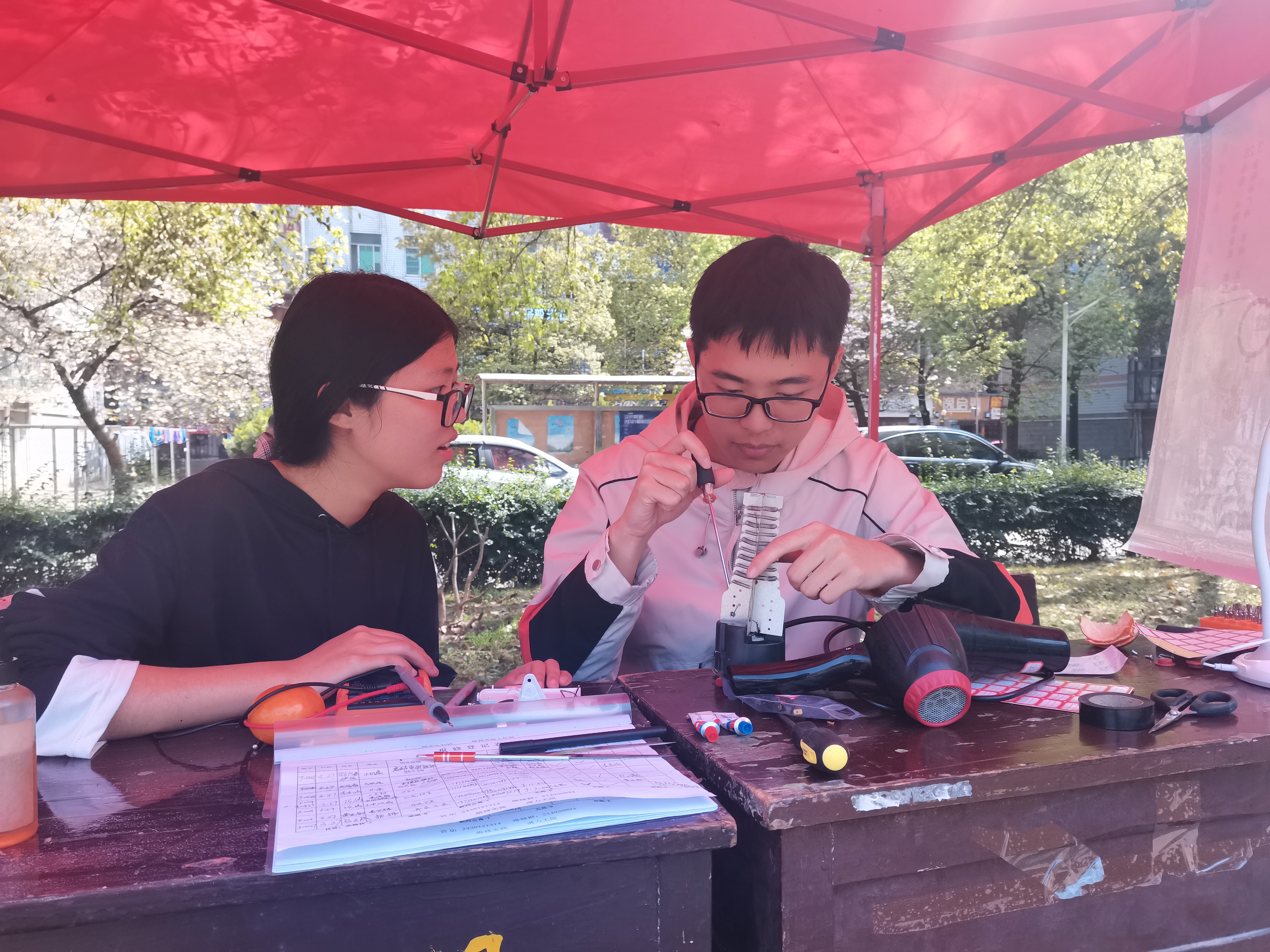 活动组织了一批经过培训的学生作为维修人员,在宿舍区摆点,免费帮助在校人员维修小家电,如电热锅、热水壶等。琴湖、北苑、兴湘、金翰林、南苑和学校教师公寓都有他们认真维修的身影。宣传片中他们说道:“地球不爆炸,我们不放假。宇宙不重启,我们不休息。你的热水壶我们承包了。”