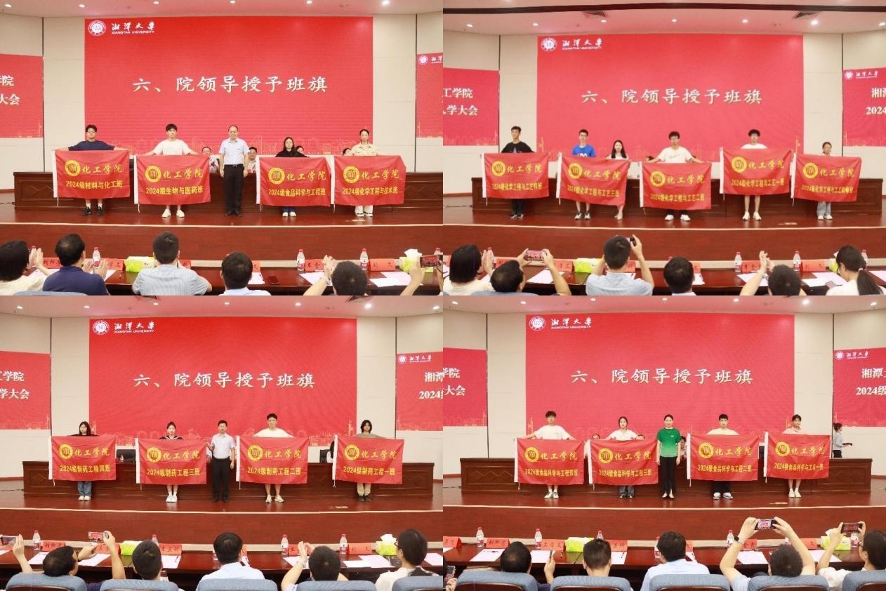 云程发轫,万里可期。研究生代表宁鹏潜鼓励新生追求梦想,充分利用资源,培养良好习惯,面对困难保持勇气,专注于个人成长路径,勇敢前进;新生代表司希睿表达了对湘潭大学的憧憬,她承诺将在湘大接受知识洗礼,直面挑战,自强不息。随后,院领导为2024级各班授旗,旗帜被送至新生手中,承载着学院的期望和新生们的梦想,激励着他们勇往直前,共同书写属于自己的辉煌篇章。