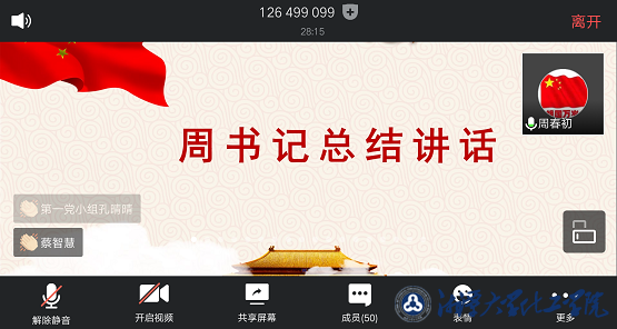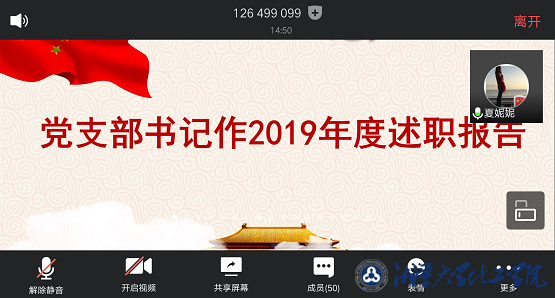 (通讯员:本科生第一党支部陈双)5月20日19点30分,化工学院本科生第一党支部通过腾讯会议平台召开了支部党员大会,会议包括近期党建工作提示、毕业生党员欢送事宜、党支部换届工作说明、落实《倡议书》优秀事迹表彰、2019年度党支部书记“双述双评”五个流程。化工学院党委副书记周春初、团委书记刘宇谦、本科生第一党支部书记夏妮及全体学生党员参加本次会议。会议由本科生第一党支部副书记佘祥主持。