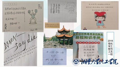 手写的文字祝福、绘制的图画、拍摄的视频,展现了各位党员与考察对象对全国各地尤其是武汉人民深切的关怀与真诚的祝福以及对抗击疫情的白衣天使与逆行者崇高的敬意。党员冲锋在前,不是口号,而是行动。在抗“疫”期间,化工学院本科生第一党支部的党员与考察对象将用行动为武汉加油!