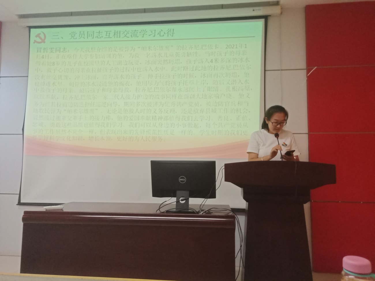 冒哲雯同志看完“帕米尔雄鹰”的拉齐尼.巴依卡为救一名落水儿童英勇牺牲的故事后,给我们分享到:“我们可以从身边的小事做起,每个共产党员从事的工作虽然不完全一样,但表现出来的先锋模范性质是一样的。” 还有同志们谈到,细细品读了乡村教师石兰松的故事后,我们作为大学生党员,更应该学习他的这种精神品质,在组织或人民需要的时候积极站出来,奉献自己的一份力量。