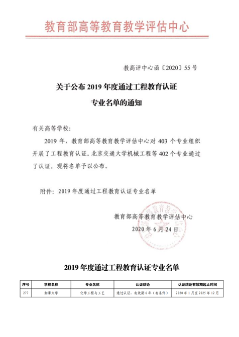 近日,根据教育部高等教育教学评估中心正式公布的《关于公布2019年度通过工程教育认证专业名单的通知》(教高评中心函〔2020〕55号)和中国工程教育专业认证协会正式公布了《关于公布北京交通大学机械工程等402个专业认证结论的通知》(工认协〔2020〕15号),英国365集团公司化学工程与工艺专业再次通过工程教育专业认证,有效期为6年(有条件),即2020 年1月至2025年12月。