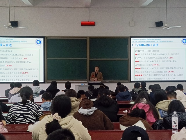 随后,伍俊文高级工程师分享了自己在大连理工大学的求学经历和毕业择业情况,讲述自己从一个迷茫的大学生慢慢改变、适应大学生活,最后将自己大学期间的锻炼经验运用到工作岗位上帮助自己成长。湖南师范大学尹笃林教授为新生带来《我们的人生之光在湘大赋能-与2023级化工学生共勉》的精彩报告,从‘行业崛起’‘政府重视’‘企业引领’‘学界融合’‘潜心研学’五个方面重点阐述了化工专业在解决卡脖子技术上的关键作用,同时以湘大化工专业优秀校友为例鼓励大家潜心研学,树立政治家、教育家、企业家、科学家的宏伟目标。尹笃林教授在讲座中与新生开展互动,邀请同学们给分享当初一志愿报考化学工程与工艺专业的初衷,通过互动环节为化学工程与工艺专业学生指明了未来发展方向,在学生中引起强烈反响。