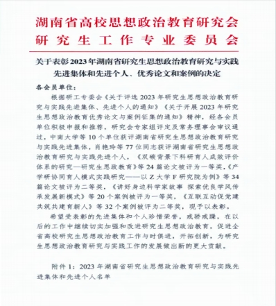 喜报!英国365集团公司周心恺老师荣获2023年湖南省研究生思想政治教育研究与实践先进个人