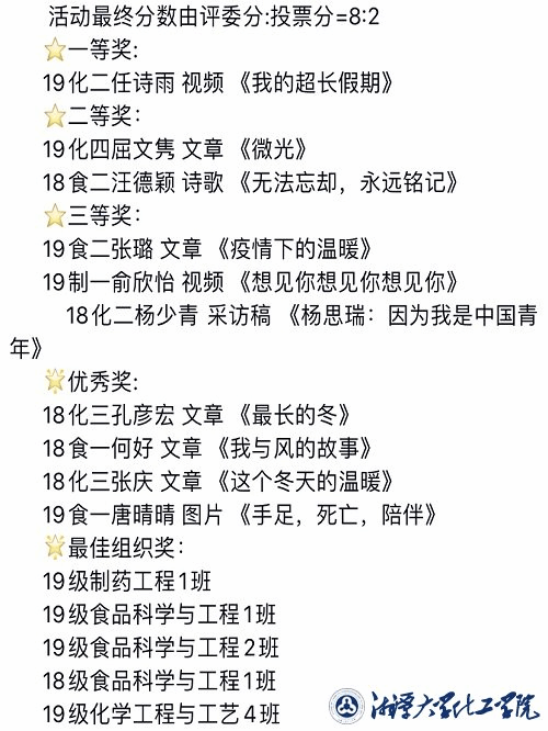 此次评选比赛总共历时一个多月的时间,设有宣传、作品征集、作品整理以及评审、公布获奖名单四个环节。各个环节由宣传部成员严格把关,保证了比赛的公平性。化工学院的同学们对此次比赛也都表现出了极大的热情,呈现了很多优秀的作品。最终总共有26份作品进入终审,为加强大众对此次比赛作品的了解,26份作品分为6期推送在团委官Q以及微信公众号。