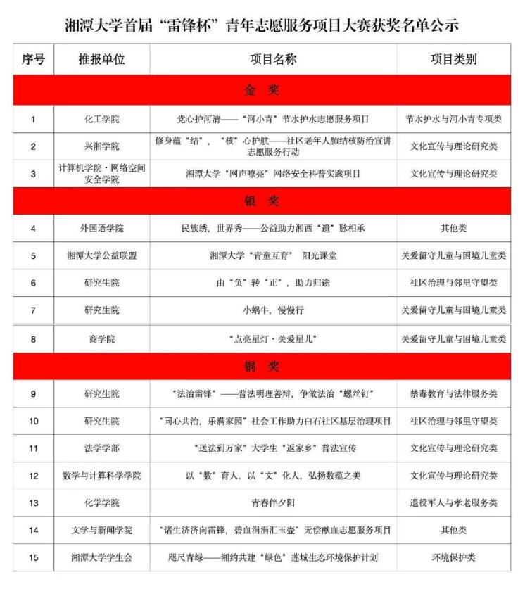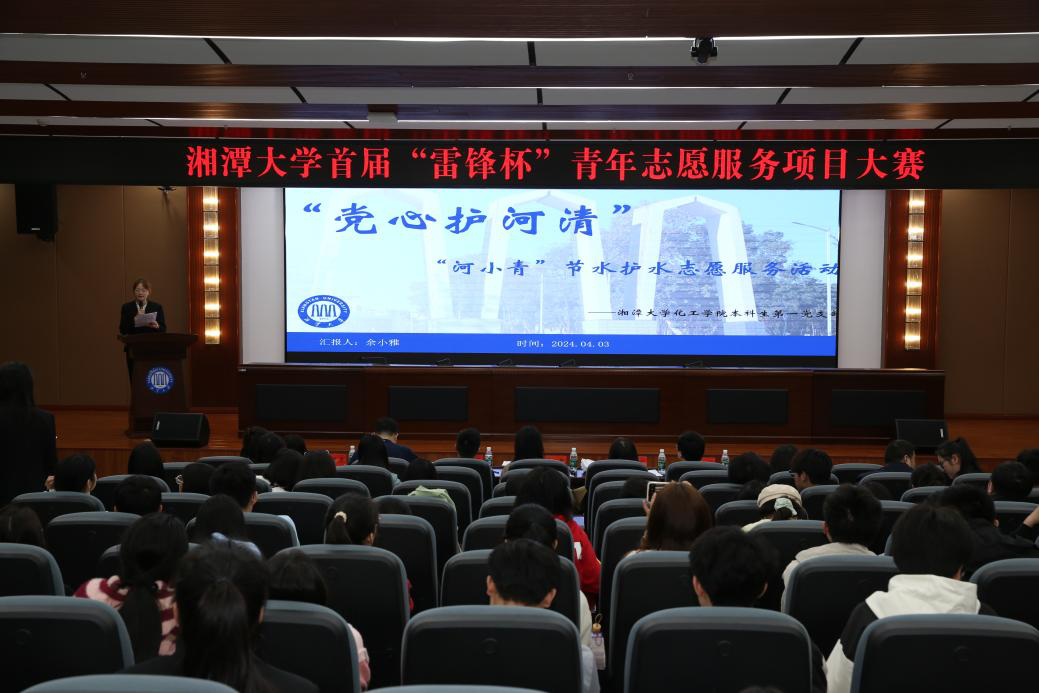 4月3日,湘潭大学首届“雷锋杯”青年志愿服务项目大赛在永雄楼西附楼一楼学术报告厅隆重举行。化工学院“党心护河清”河小青节水护水志愿服务项目荣获大赛第一名。