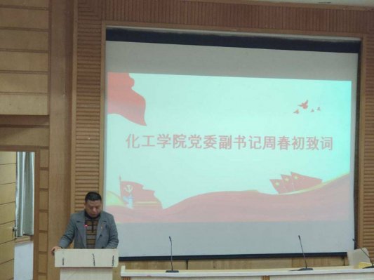 大会第二项,化工学院党委副书记周春初致辞。周书记指出,中国共产党在内忧外患中诞生,在磨难挫折中成长、在攻坚克难中壮大,与人民同呼吸、共命运、心连心、风雨同舟、生死与共,从胜利走向胜利,充分展示了我们党的百年伟大成就和宝贵经验。在逆境中表现出的顽强与创造的辉煌成就,无不说明中国共产党完全有信心有能力带领中国人民走好有中国特色的社会主义道路,实现中国梦,实现中华民族伟大复兴。并对培训班学员提出三点要求,一是要加强理论学习。理论学习要同党的方针、政策、“四史”学习结合起来(学党史、新中国史、改革开放史、社会主义发展史), 将“四史”学习教育往深里走、往心里走、往实里走,把“四史”学习教育同深入学习贯彻落实党的十九届四中、五中全会精神结合起来,端正自己的入党动机,树立正确的世界观、人生观和价值观,做到从思想上入党。将理论学习与爱党爱国结合起来,不同时代青年有不同的追求和责任,只有坚持学习才能从思想上坚定理想与信念,不忘初心才能自觉,担当使命才能使理想更加坚定。二是要将追求与实际生活结合起来,牢记毛主席的殷殷嘱托和习近平总书记对湘潭大学的殷切期望。无论是遵纪守法、文明修养、专业学习,还是从自我做起,都应该以共产党员的标准严要求自己,做表率、做遵纪守法的模范、做创建文明寝室的模范、做好好学习的模范、做执行学校政策与决定的模范。学做一盏灯泡,“点亮自己、照亮别人、创造光明”。我们党员也好、发展对象也好、入党积极份子也好,都应该有能力去影响周围的人。三是要将人文素养和科研精神结合起来。竞争是人才的竞争,少年强则国强,用脚踏实地的科研精神将专业学好。上天入海,衣食住行都与化学化工有关,干一行、爱一行,早日成就一身为党和国家贡献的本领。