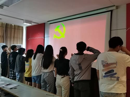 新吸收的预备党员全部站上讲台,面对党旗,进行入党宣誓。当举起他们的右手抬头望向庄严的党旗时,当入党宣誓词一个字一个字从他们口中念出来时,我能够深深地体会到他们由内而外散发出的自豪感。