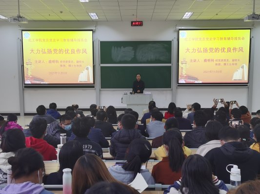 11月9日下午,副校长盛明科在研究生楼二阶梯教室为化工学院全体党员作党史学习教育专题辅导报告。