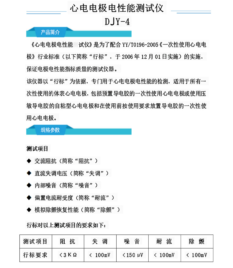 该仪器以“行标”为依据,专门用于心电电极电性能的检测,适用于所有一次性使用的体表心电电极。
